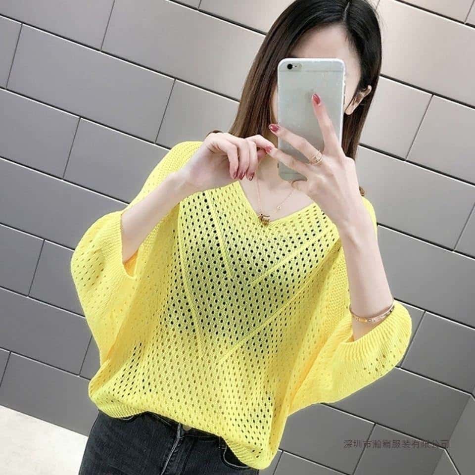 慵懶風薄款V領蝙蝠袖鏤空罩衫