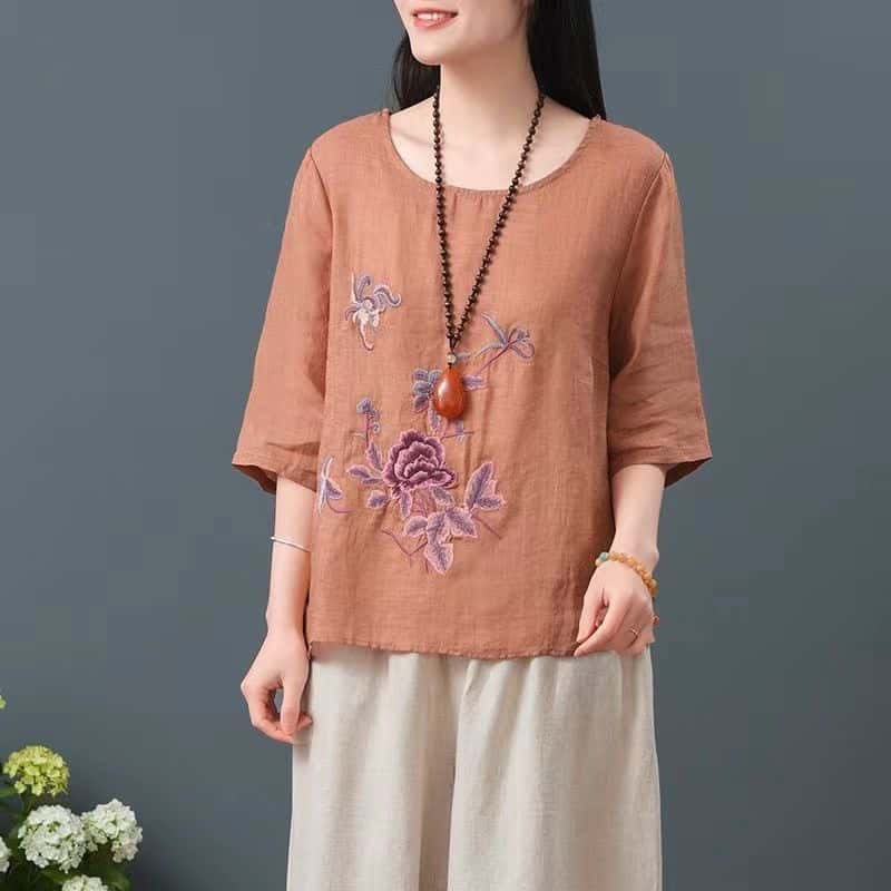 買一送一!文藝復古中式刺繡棉麻衫