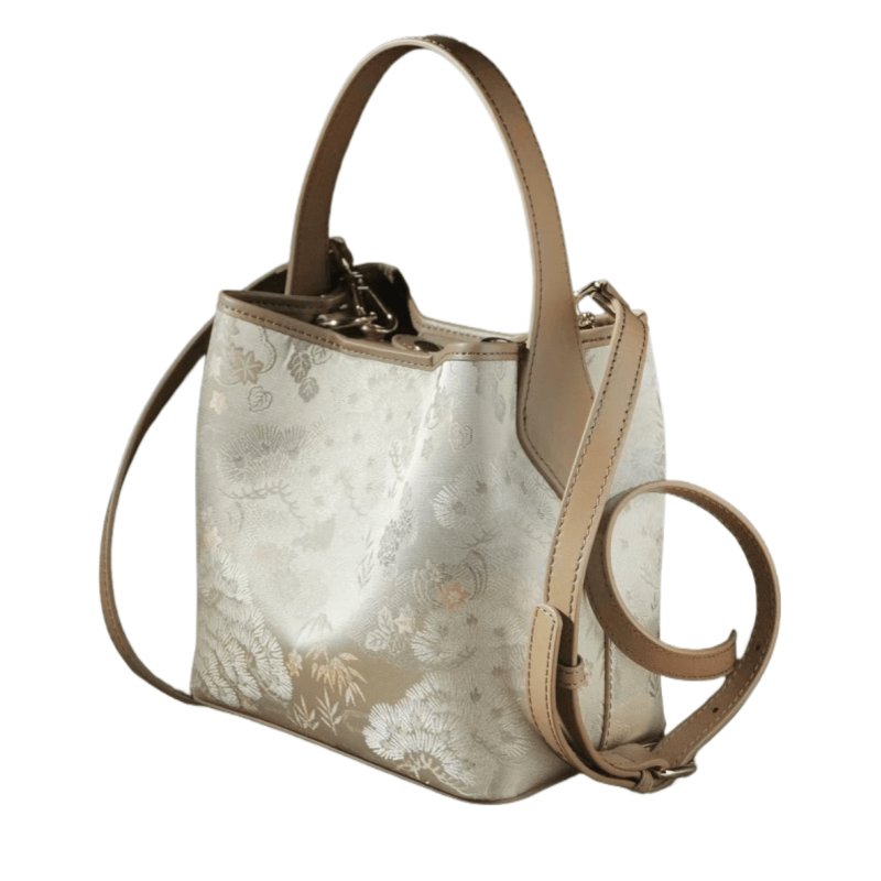 新中式宋錦二層牛皮雙帶手提水桶包