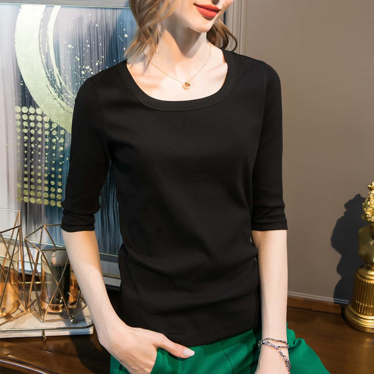 5分鐘前2025年新款新疆棉u領中袖打底衫 黑色一件