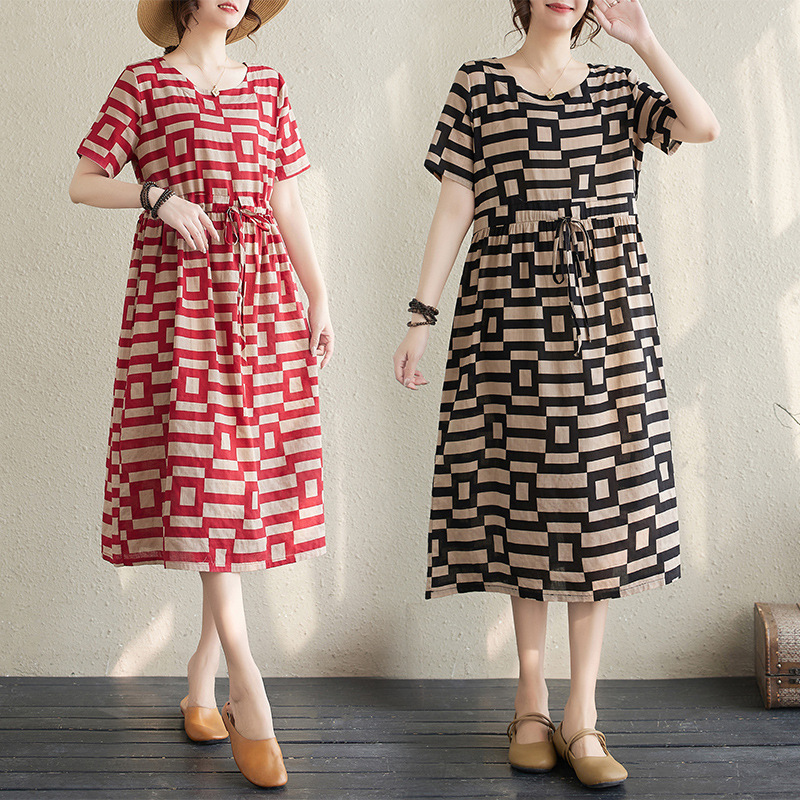 5分鐘前民族風文藝印花收腰顯瘦棉麻裙 一件 紅色 尺碼:XL
