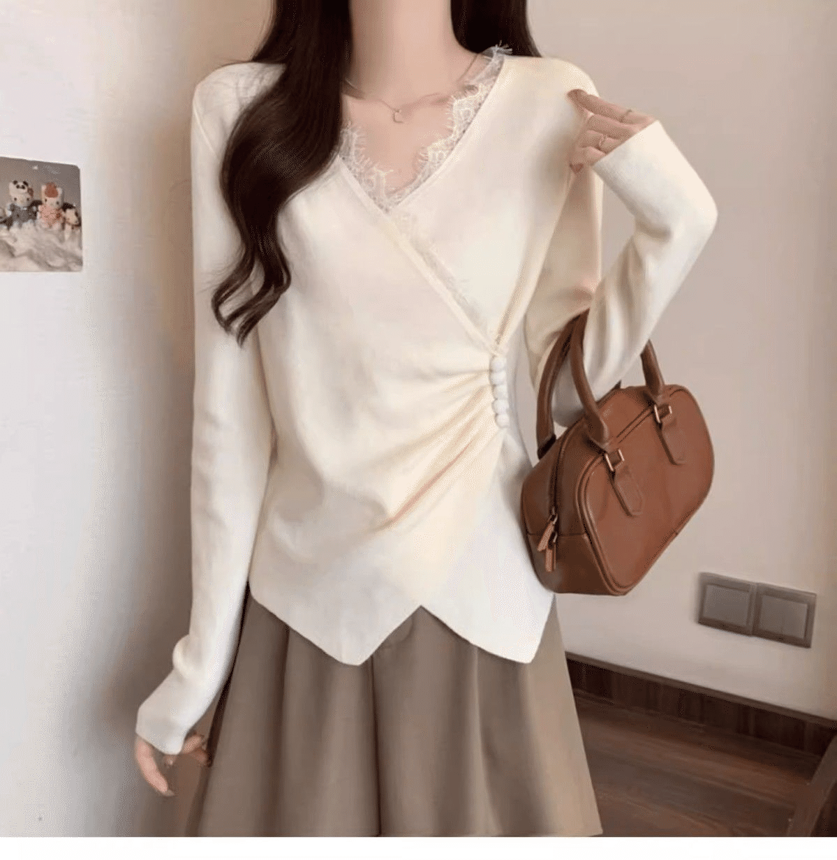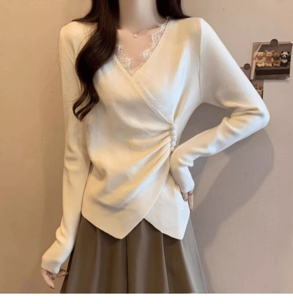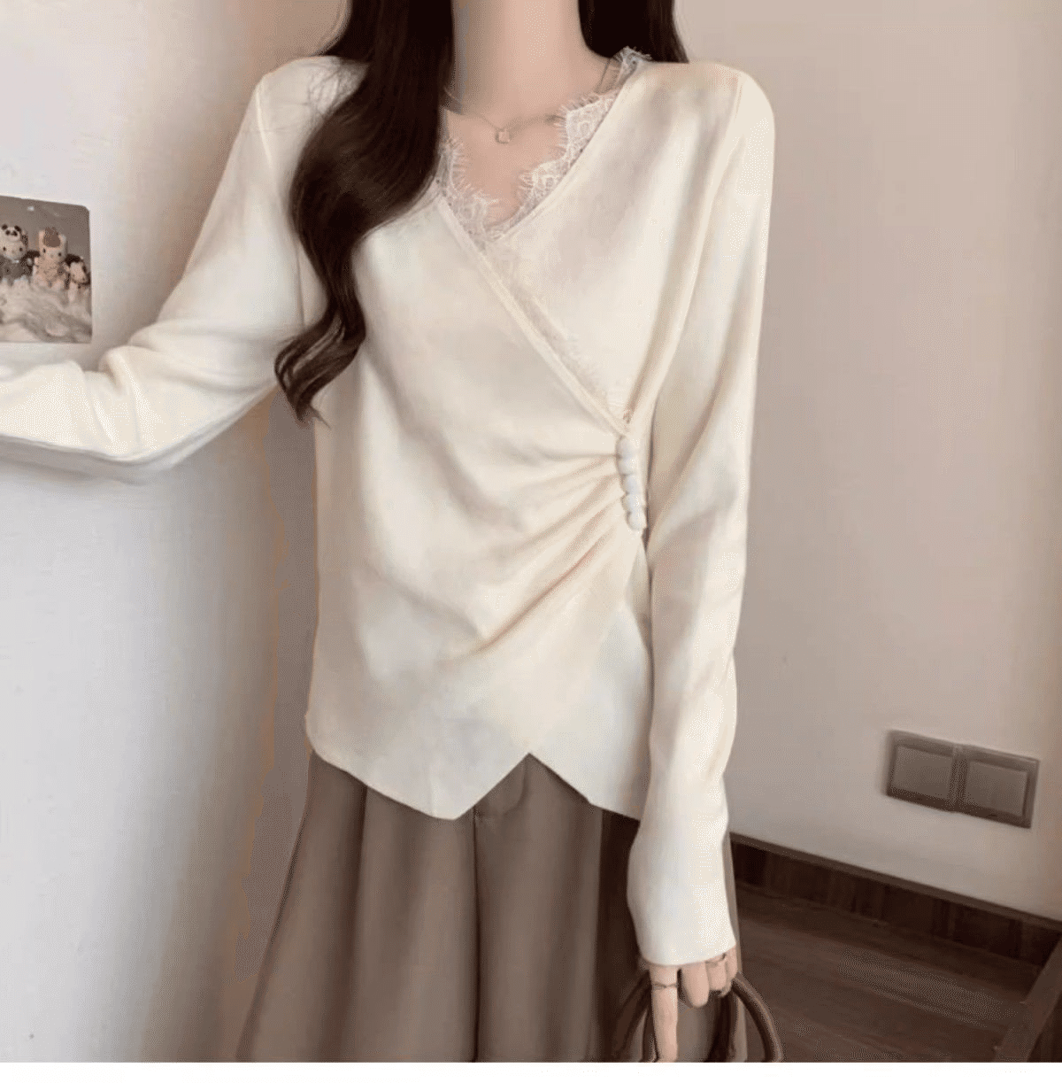 半小時前秋冬季新款德絨設計感蕾絲拼接V領顯瘦打底衫 灰色+白色