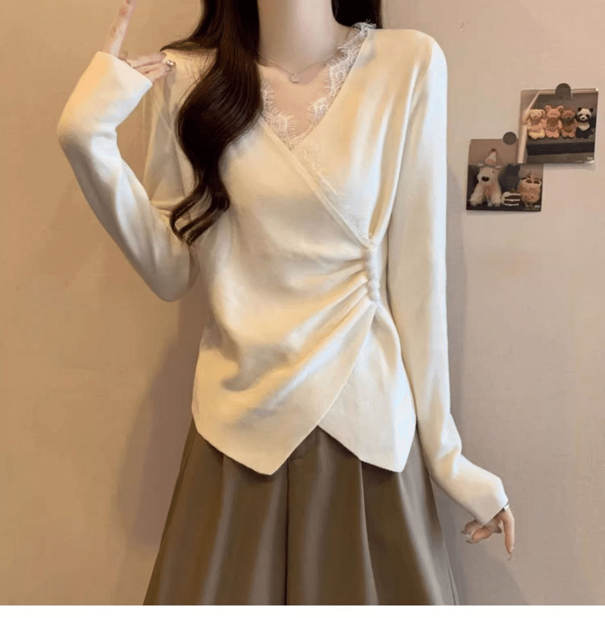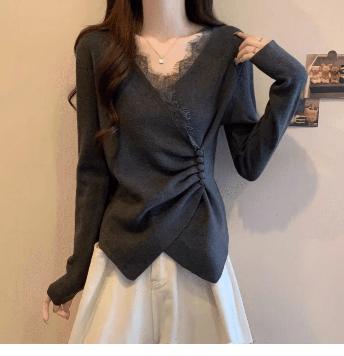 5分鐘前秋冬季新款德絨設計感蕾絲拼接V領顯瘦打底衫 灰色+白色