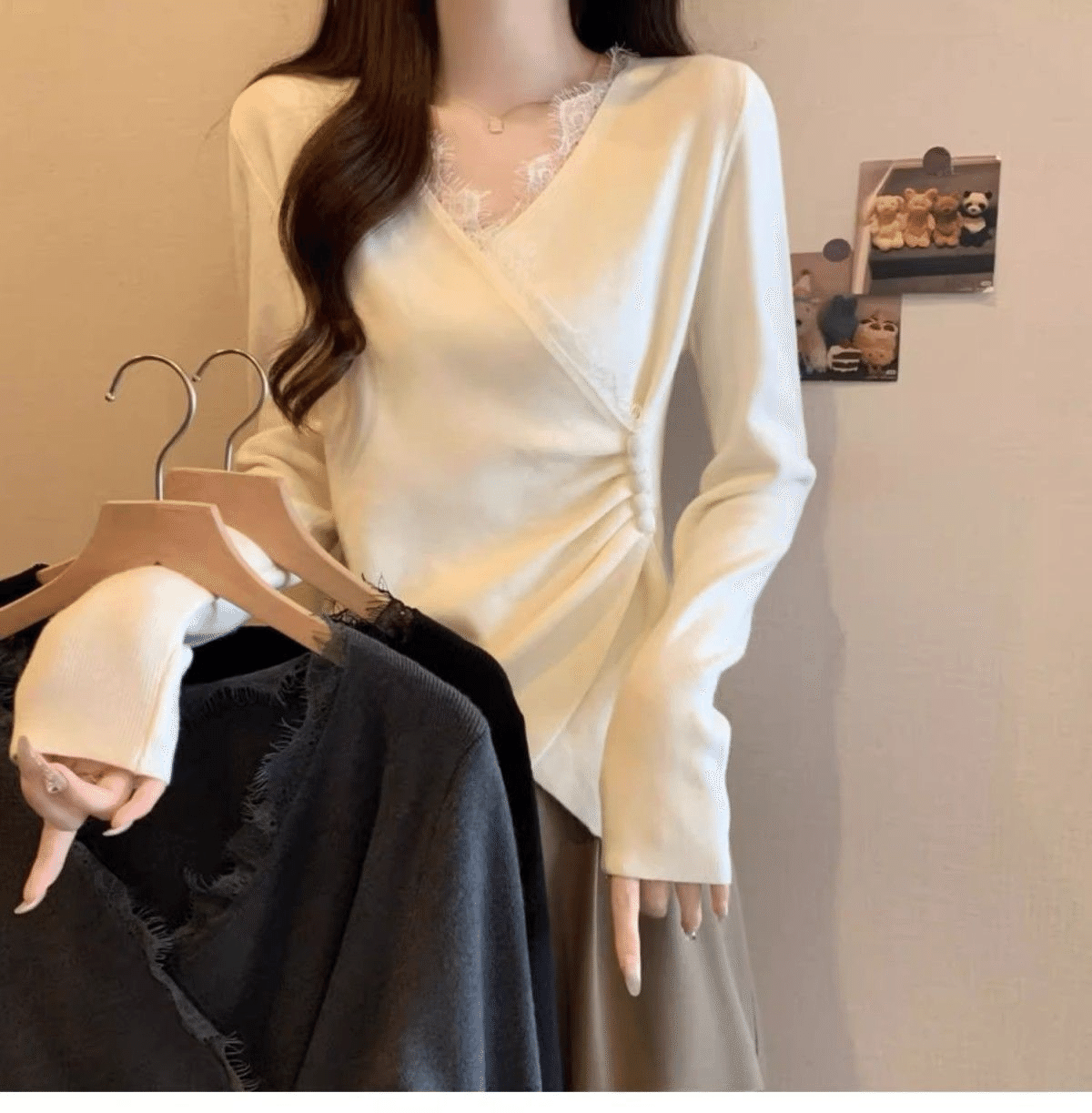 4分鐘前秋冬季新款德絨設計感蕾絲拼接V領顯瘦打底衫 白色+黑色