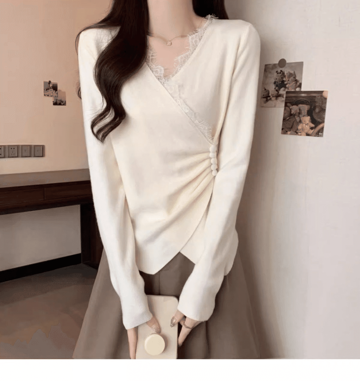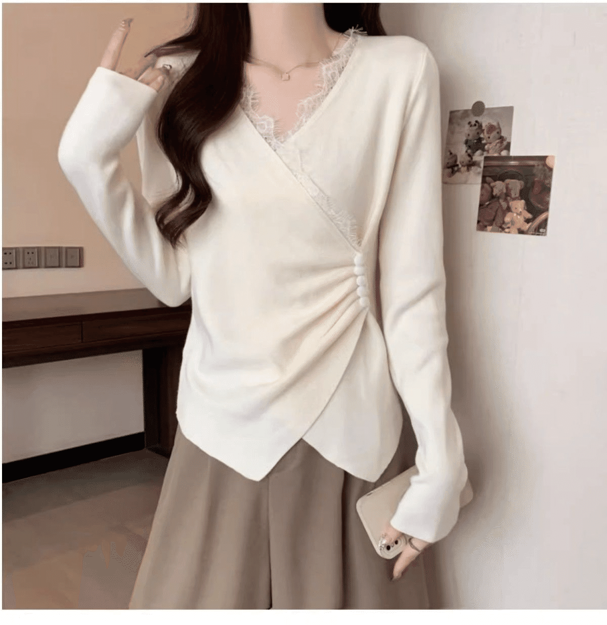 2分鐘前秋冬季新款德絨設計感蕾絲拼接V領顯瘦打底衫 白色+黑色