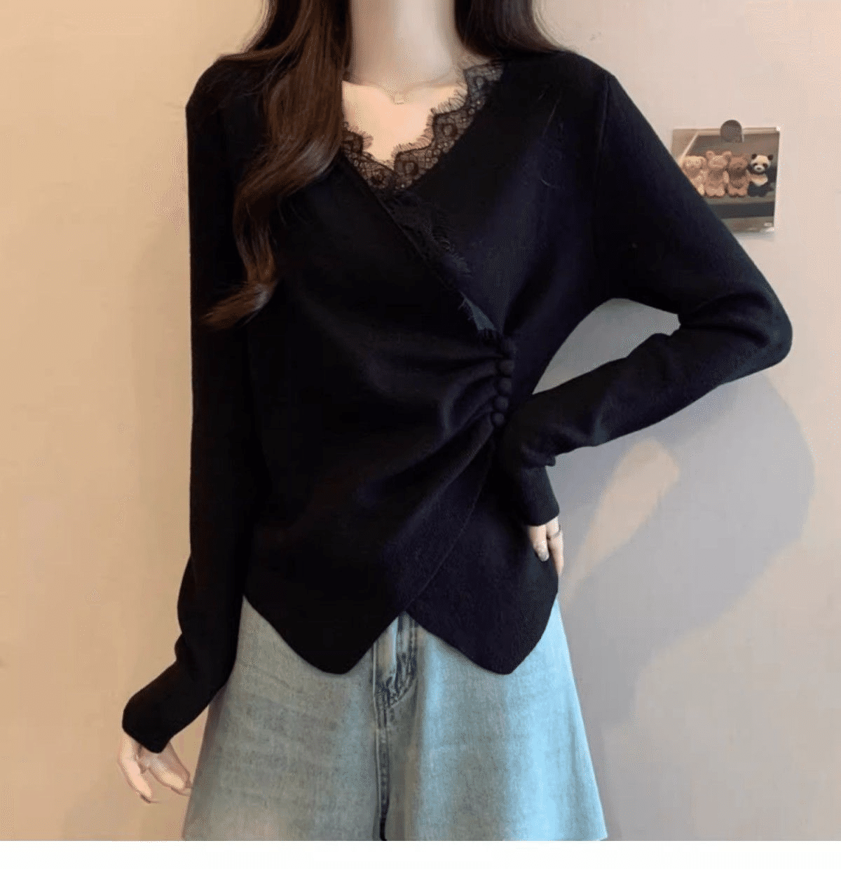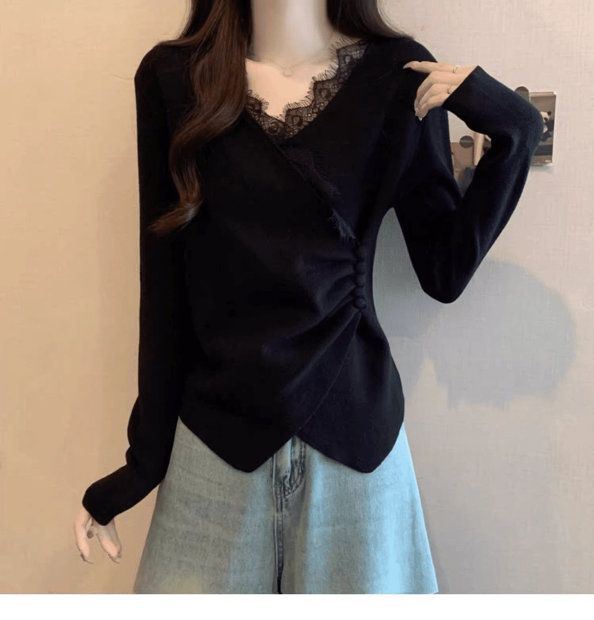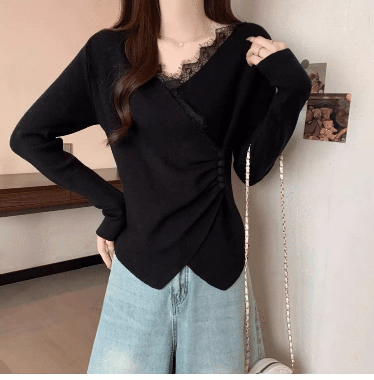 5分鐘前秋冬季新款德絨設計感蕾絲拼接V領顯瘦打底衫 黑色+灰色