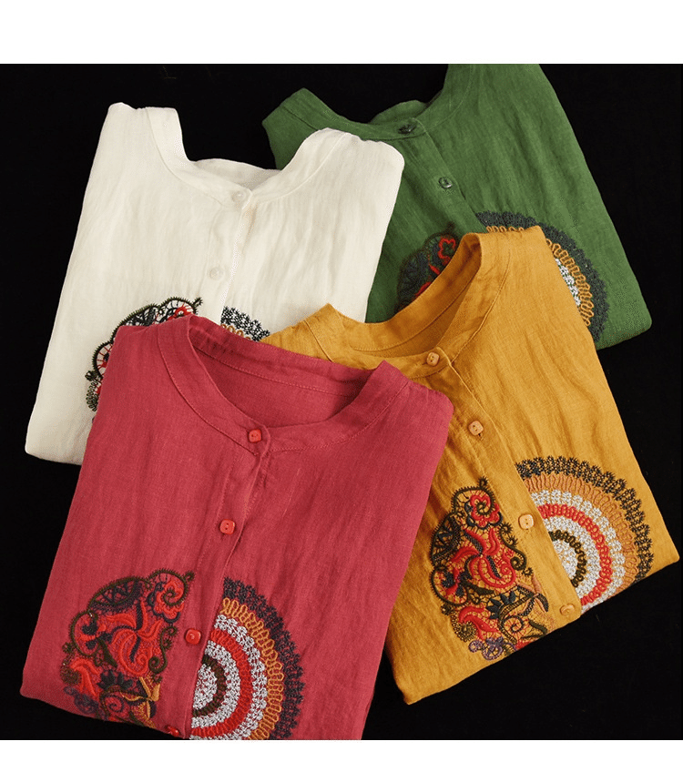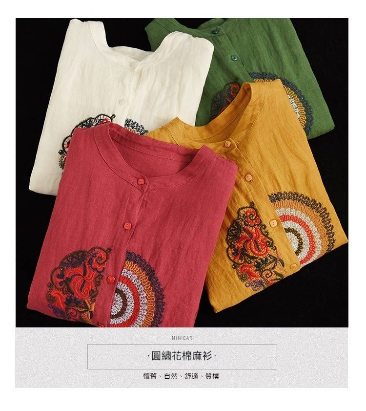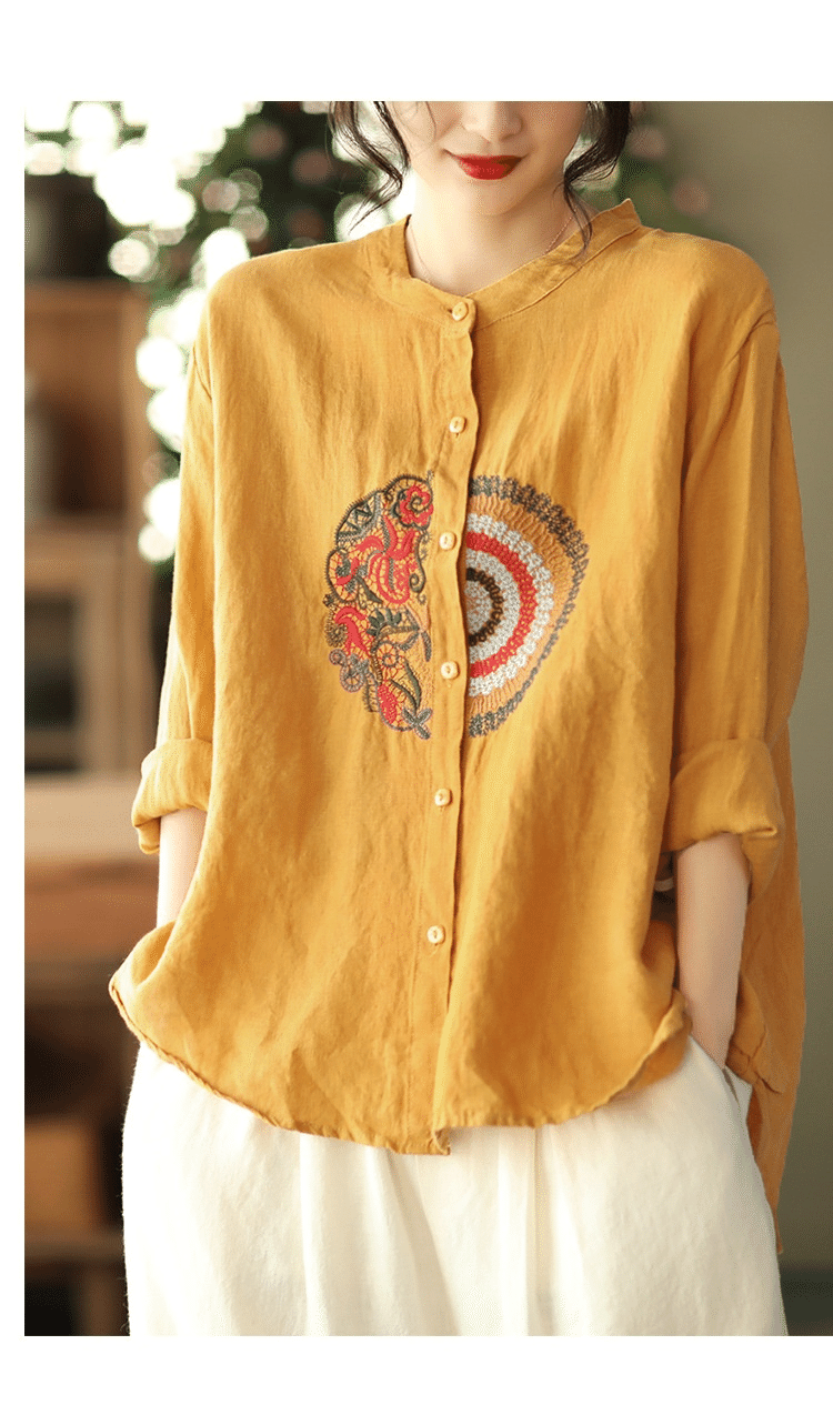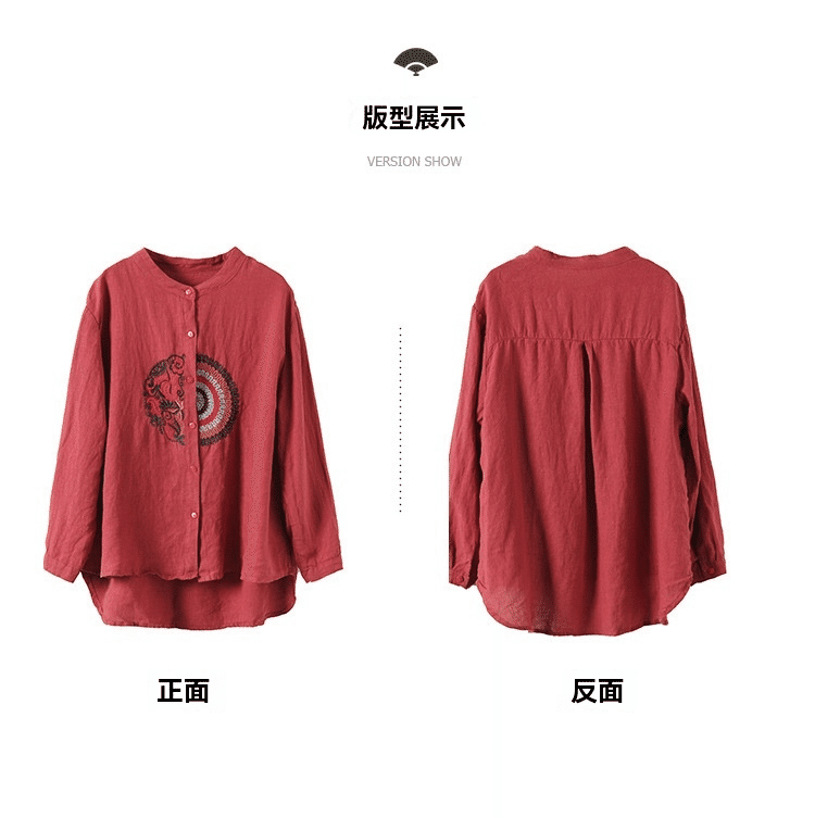2分鐘前新中式國風刺繡棉麻襯衫 紅色+黃色