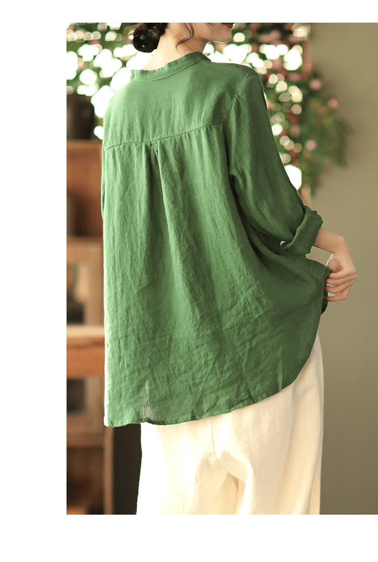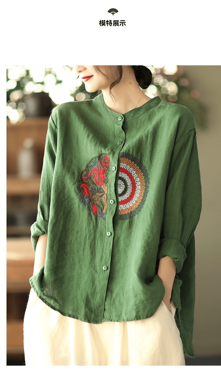 5分鐘前新中式國風刺繡棉麻襯衫 綠色+白色
