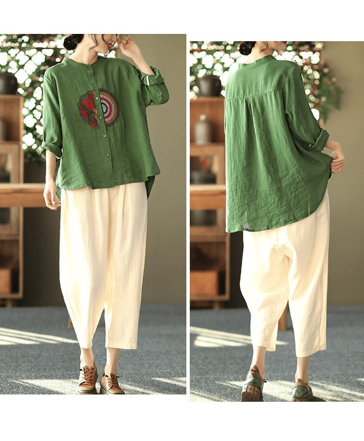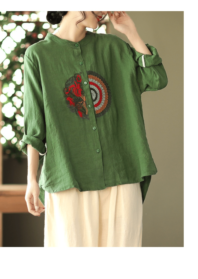 半小時前新中式國風刺繡棉麻襯衫 綠色+白色