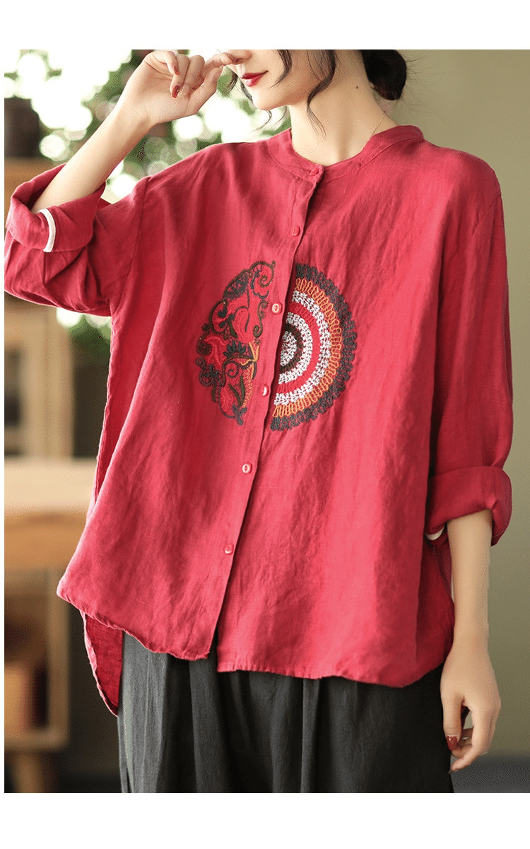 5分鐘前新中式國風刺繡棉麻襯衫 紅色+黃色
