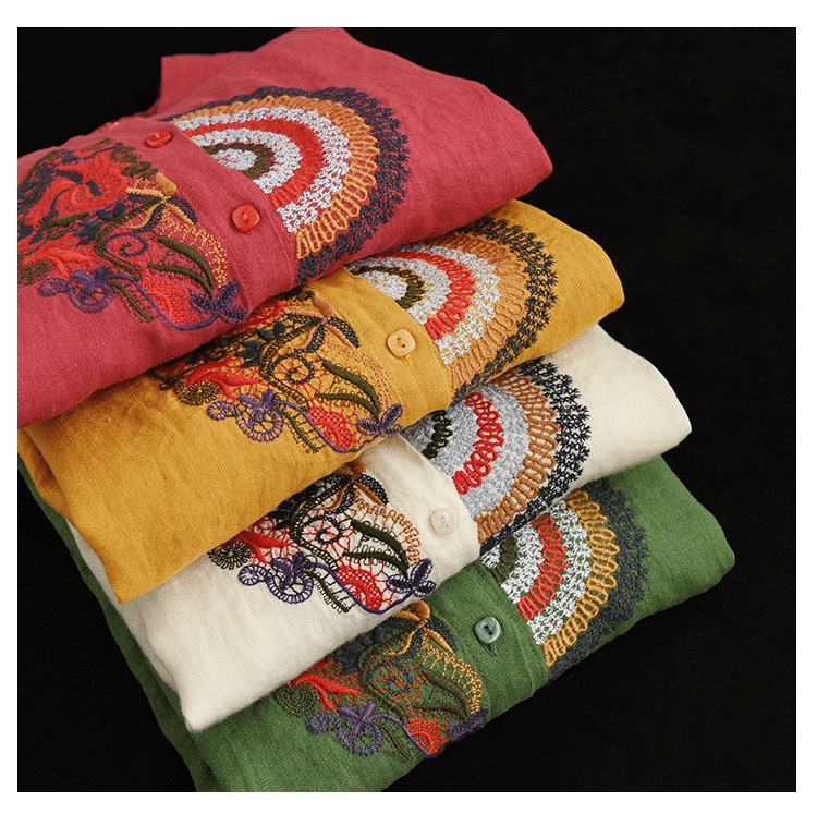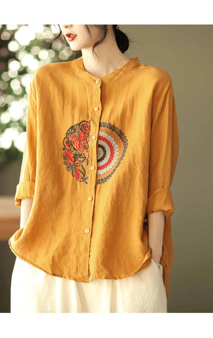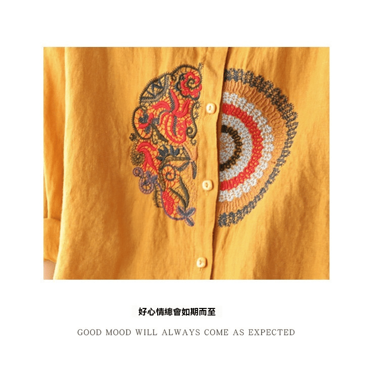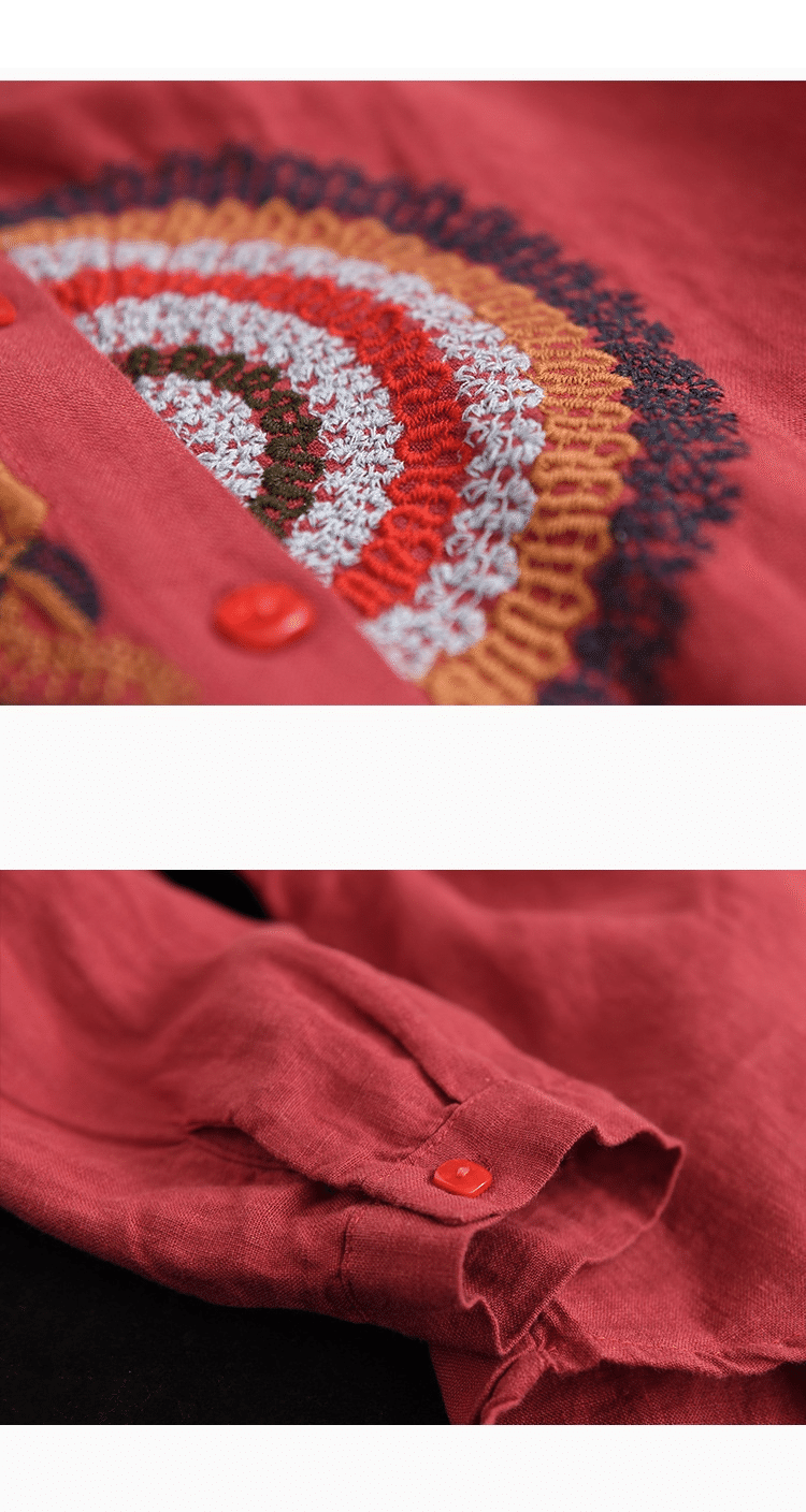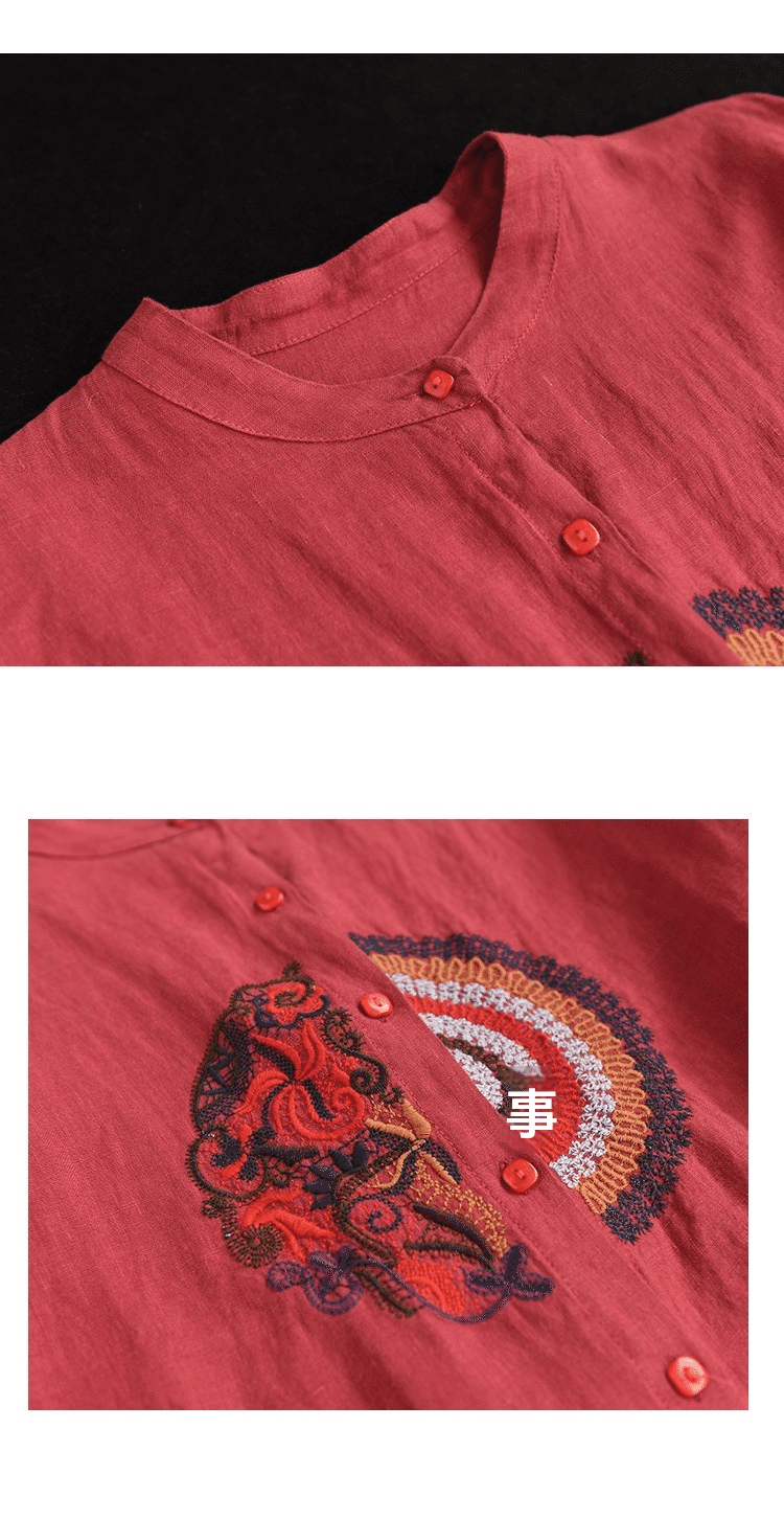 3分鐘前新中式國風刺繡棉麻襯衫 紅色+黃色
