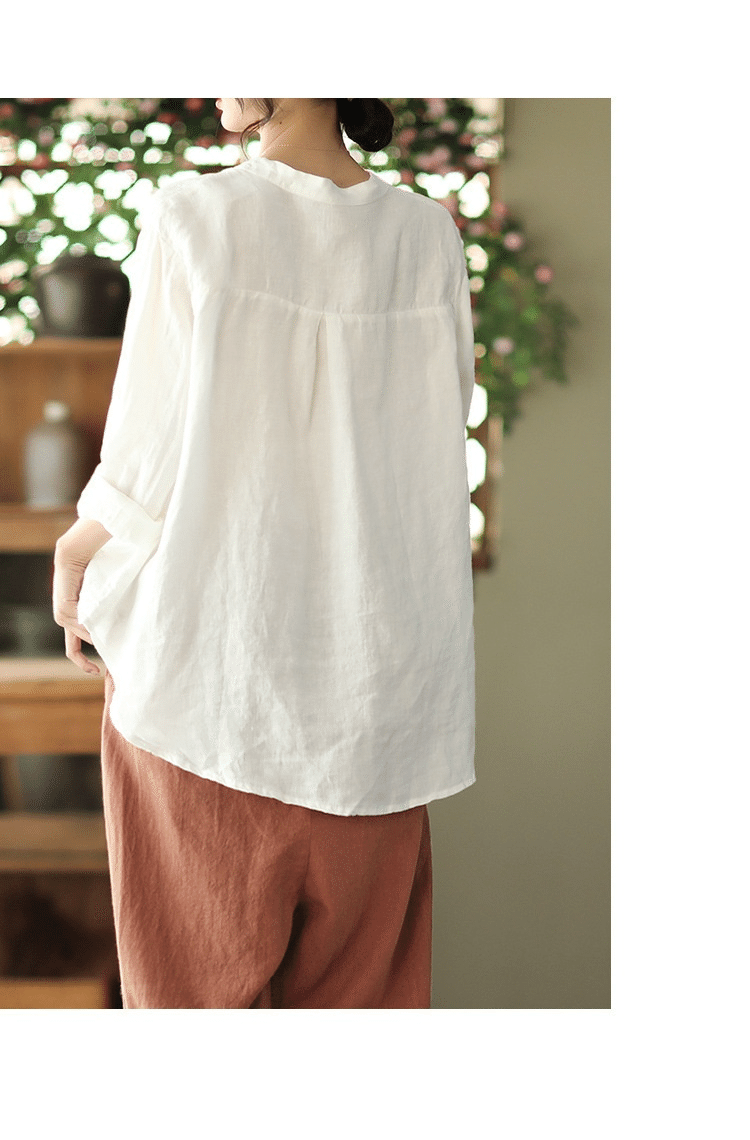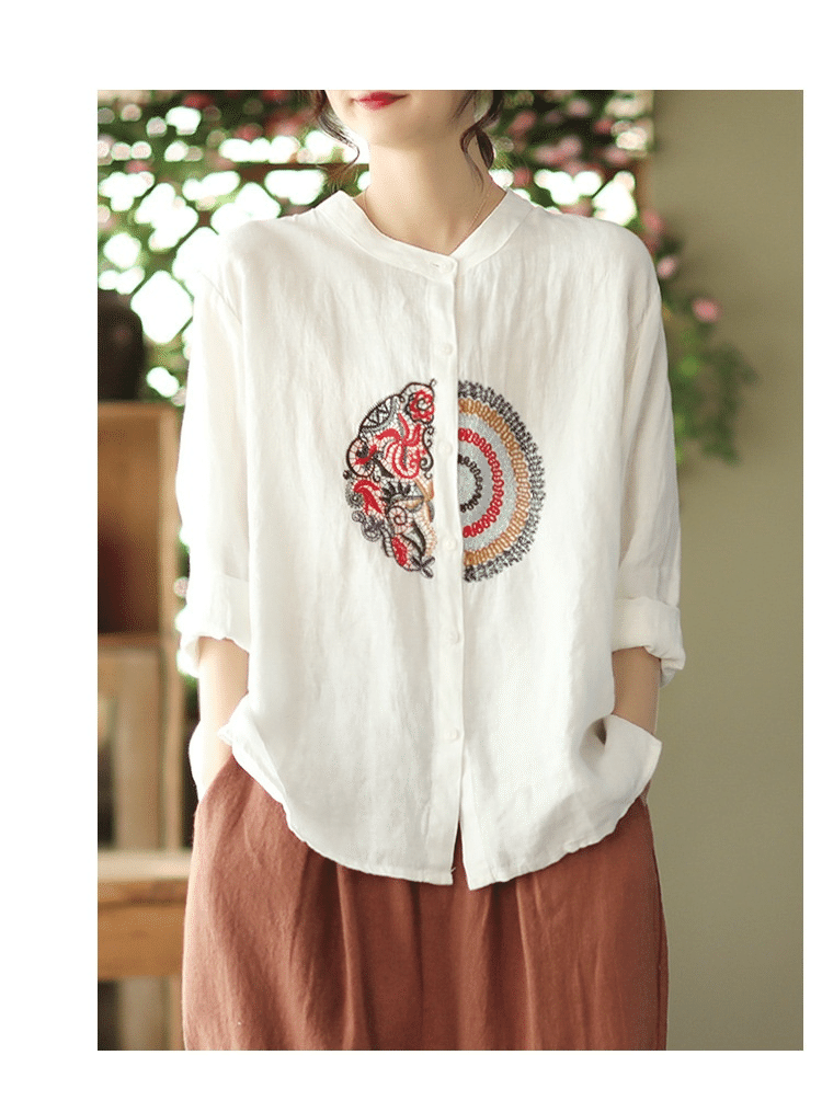 5分鐘前新中式國風刺繡棉麻襯衫 白色+紅色