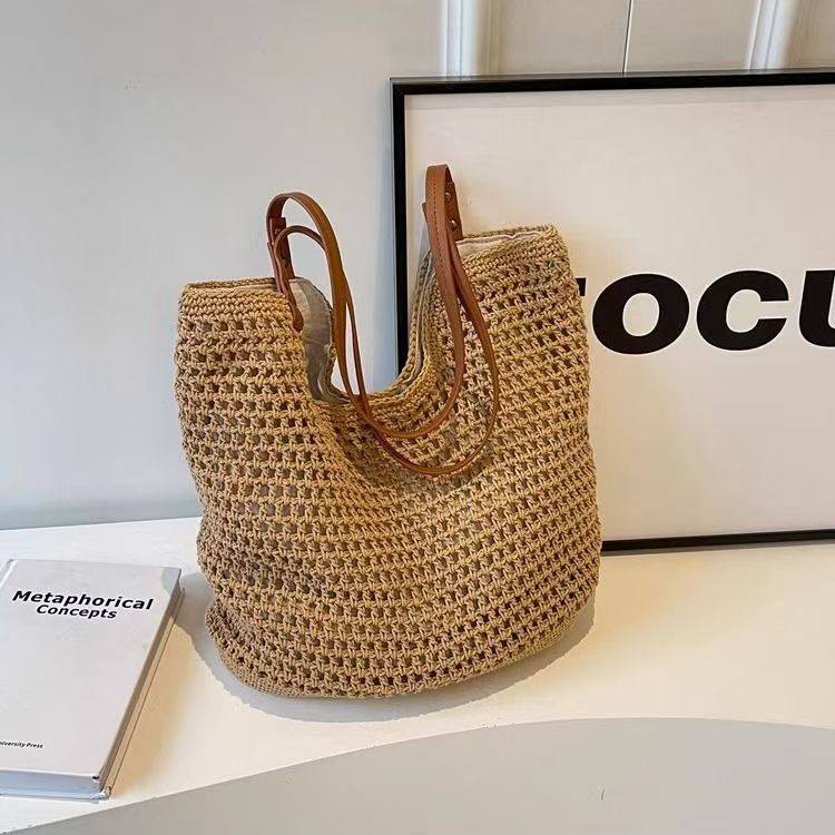 1分鐘前大容量草編通勤托特包 咖色 大號 磁釦款