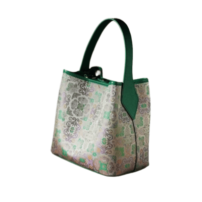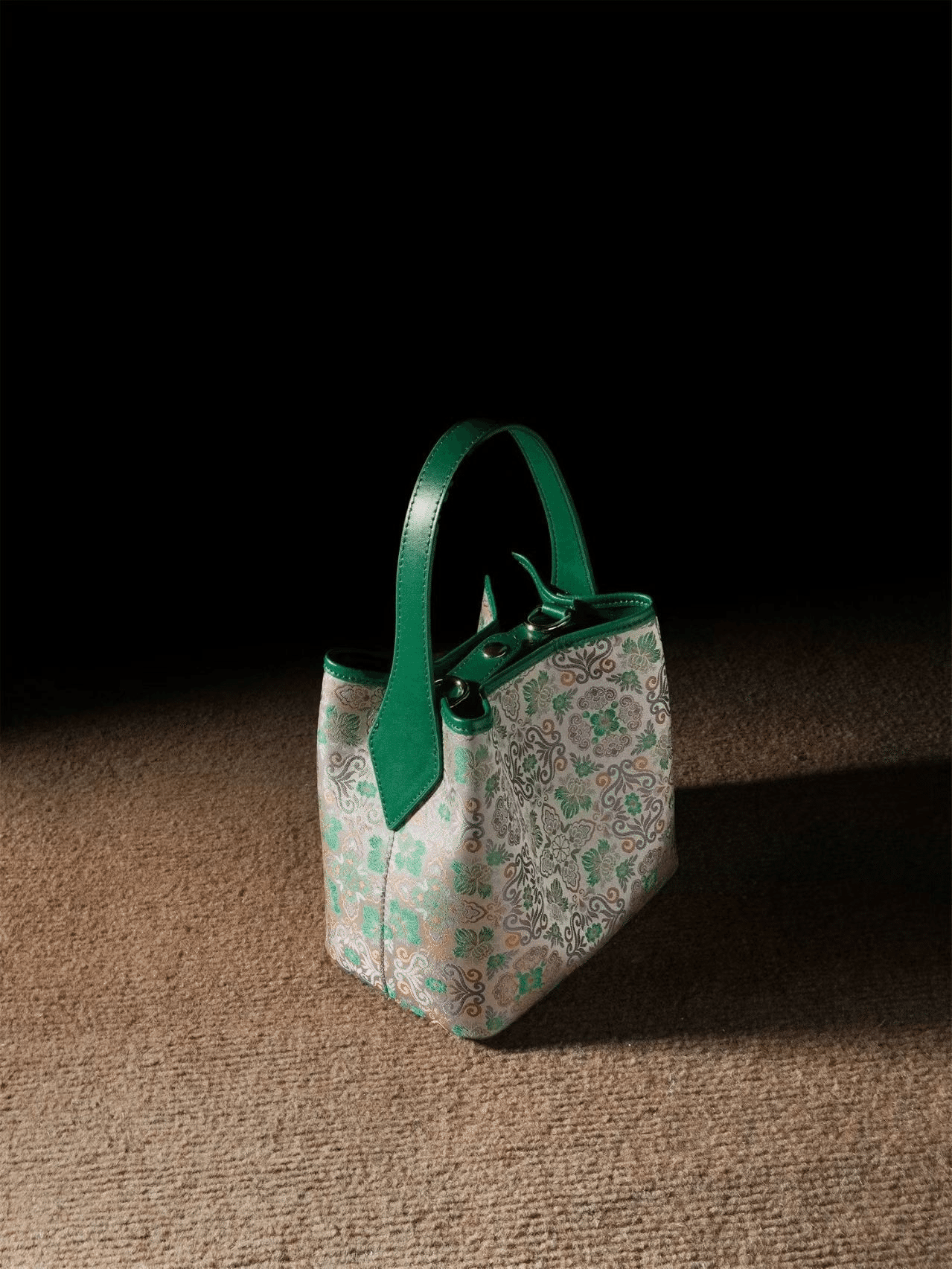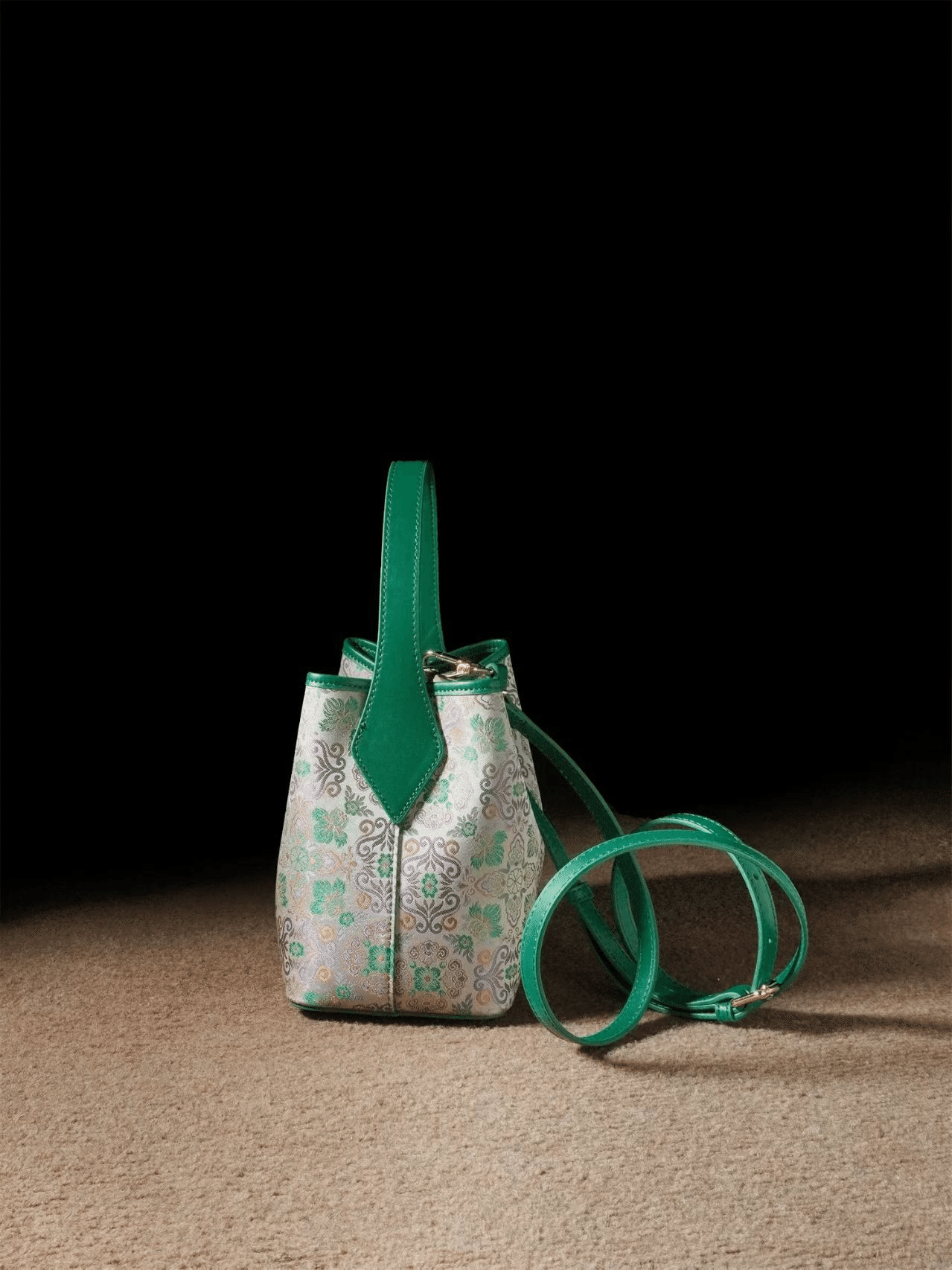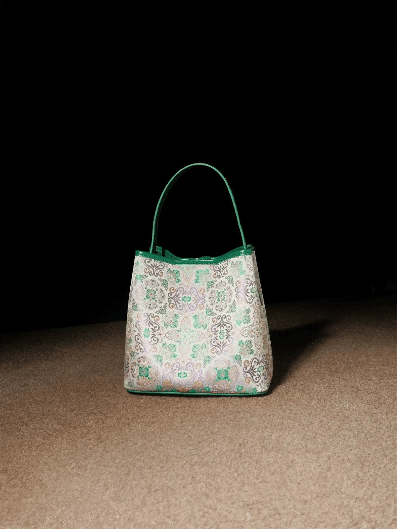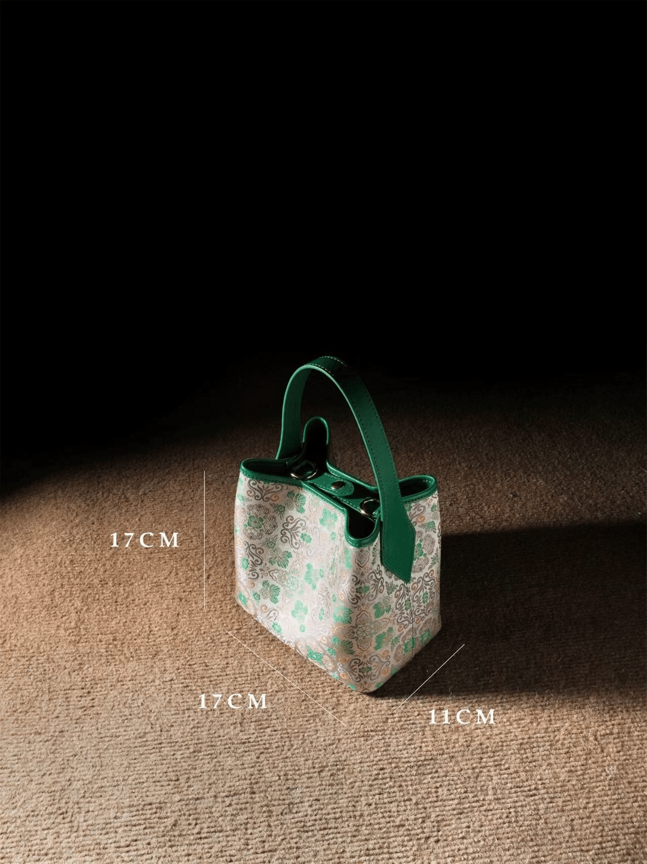 2分鐘前新中式宋錦二層牛皮雙帶手提水桶包 墨綠色 (尺寸:長17cm*寬11cm*高17cm)