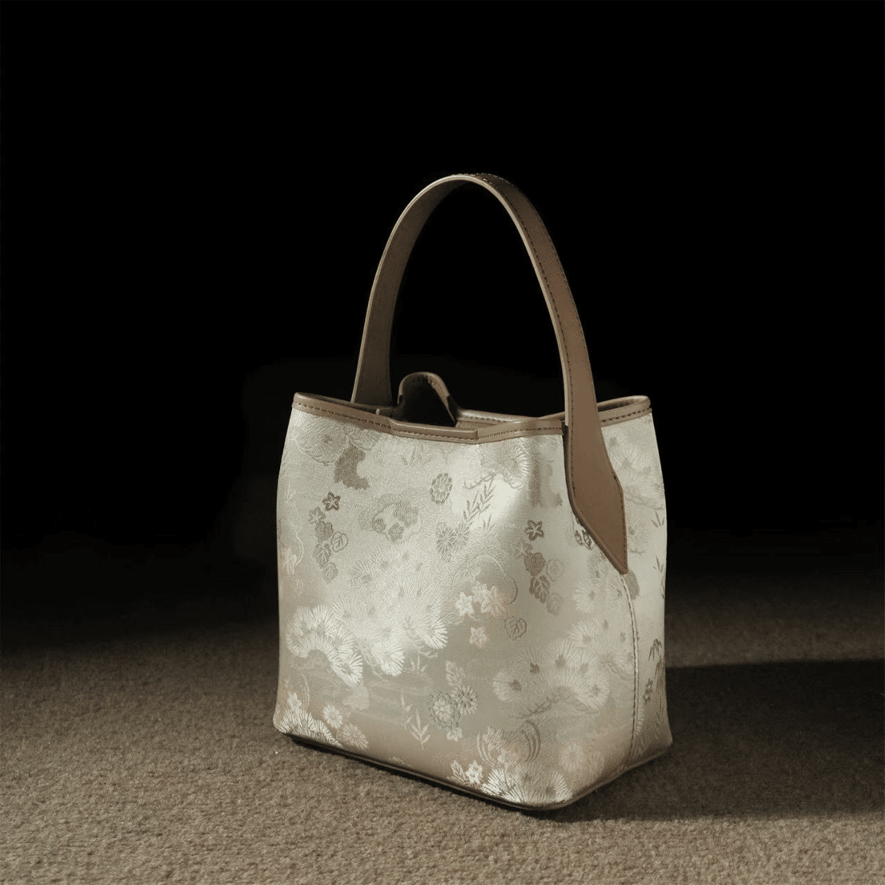 4分鐘前新中式宋錦二層牛皮雙帶手提水桶包 咖色 (尺寸:長17cm*寬11cm*高17cm)