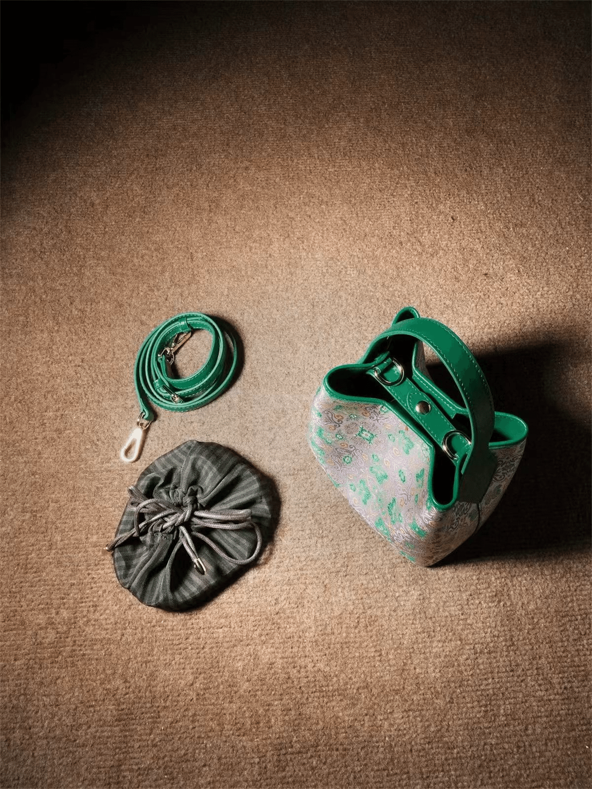 半小時前新中式宋錦二層牛皮雙帶手提水桶包 墨綠色 (尺寸:長17cm*寬11cm*高17cm)